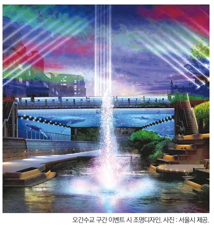 특히, 오간수교 구간은 첨단 기술과 미디어아트를 결합한 활력 있는 공간으로 변모한다. 교량에는 성곽을 모티브로 한 장식 조명과 빛의 봉화를 설치해 청계