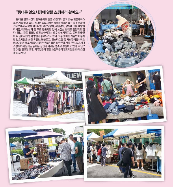 (SNS)를 통해 소개되면서 중장년층은 물론 외국인과 가족 단위, MZ 세대 쇼핑객까지 몰리는 동대문 상권의 새로운 명소로 부상하고 있다. 지난 7월 20일 일요일 오후, 외국인들과 알뜰 쇼핑객들이 일요시장을 찾아 쇼핑