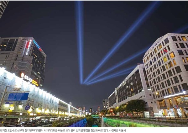 2027년까지 청계광장~오간수교 야간경관 조성 청계천 복원 20주년을 맞아 추진하는 ‘청계천 야간이를 배경으로 5개의 미디어폴이 서치라이트를 하늘로 쏘아 올려 빛의 출발점을 형상화했다.