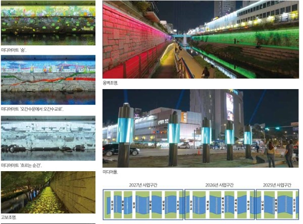 옹벽조명. 미디어폴. 2027년 사업구간 2026년 사업구간 2025년 사업구간 동대문 상권 활성화와 관광 경쟁력 강화 기여 서울시는 이번 점등식을 통해 청계천이 낮에는 도심의 여가공간으로, 밤에는 빛과 문화가 흐르는 감성형 공간으로 확장되도록 조성을 이어갈 계획이다. 특히 향후 조성될 다리와 산책로 구간에는 각 구간의 상징성을 담아낸 다채로운 조명 콘텐츠를 도입해 청계천을 사계절 걷고 머무는 도심형 야간문화 동선으로 성장시켜 나갈 예정이다.