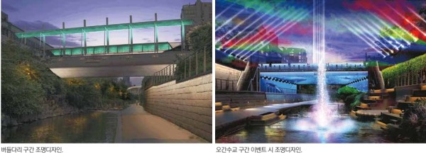 오간수교 구간은 첨단 기술과 미디어아트를 결합한 활력 있는 공간으로 변모한다. 교량에는 성곽을 모티브로 한 장식 조명과 빛의 봉화를 설치해 청계천과 한양도성의 역사적 상징성을 부각시키고, 하부에는 음향과 결한 미디어아트를 도입해 문화와 예술이 어우러진 체험 공간을 제공한다. 여기에 폐플라스틱을 재활용한 친환경 조명벤치를 설치해 지속 가능성을 고려한 쉼터로 활용된다.