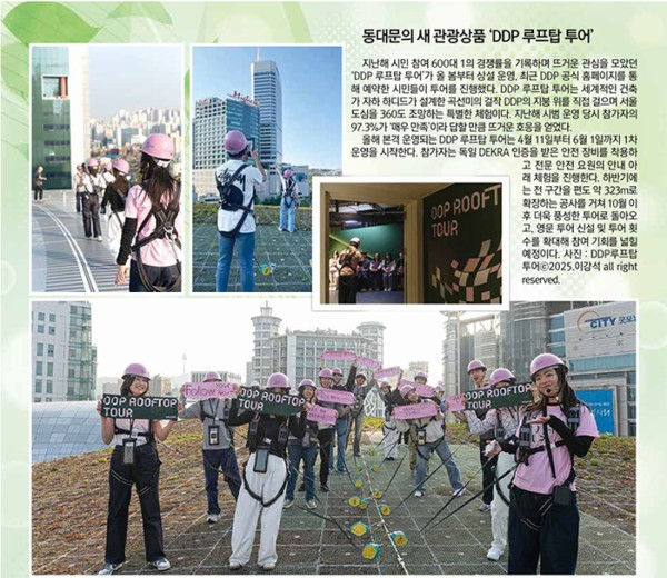 올해 본격 운영되는 DDP 루프탑 투어는 4월 11일부터 6월 1일까지 1차 운영을 시작한다. 참가자는 독일 DEKRA 인증을 받은 안전 장비를 착용하고 전문 안전 요원의 안내 아래 체험을 진행한다. 하반기에 는 전 구간을 편도 약 323m로 확장하는 공사를 거쳐 10월 이후 더욱 풍성한 투어로 돌아오고, 영문 투어 신설 및 투어 횟수를 확대해 참여 기회를 넓힐 예정이다. 사진 : DDP루프탑투어ⓒ2025.이강석 all right reserved